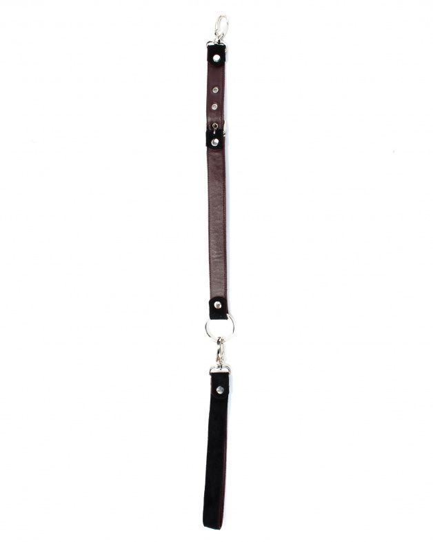 Поводок с одной стороны выполнен из натуральной кожи бордового цвета, с другой стороны из черной замши. На одном конце имеется петелька для руки. Длина изделия регулируется металлической пряжкой и ремешком от 60 до 70 см, карабины и кольцо надежно фиксируют в подчинении, обеспечивая погружение в сладкий мир ограничений. Ширина ремешка - 2 см.