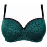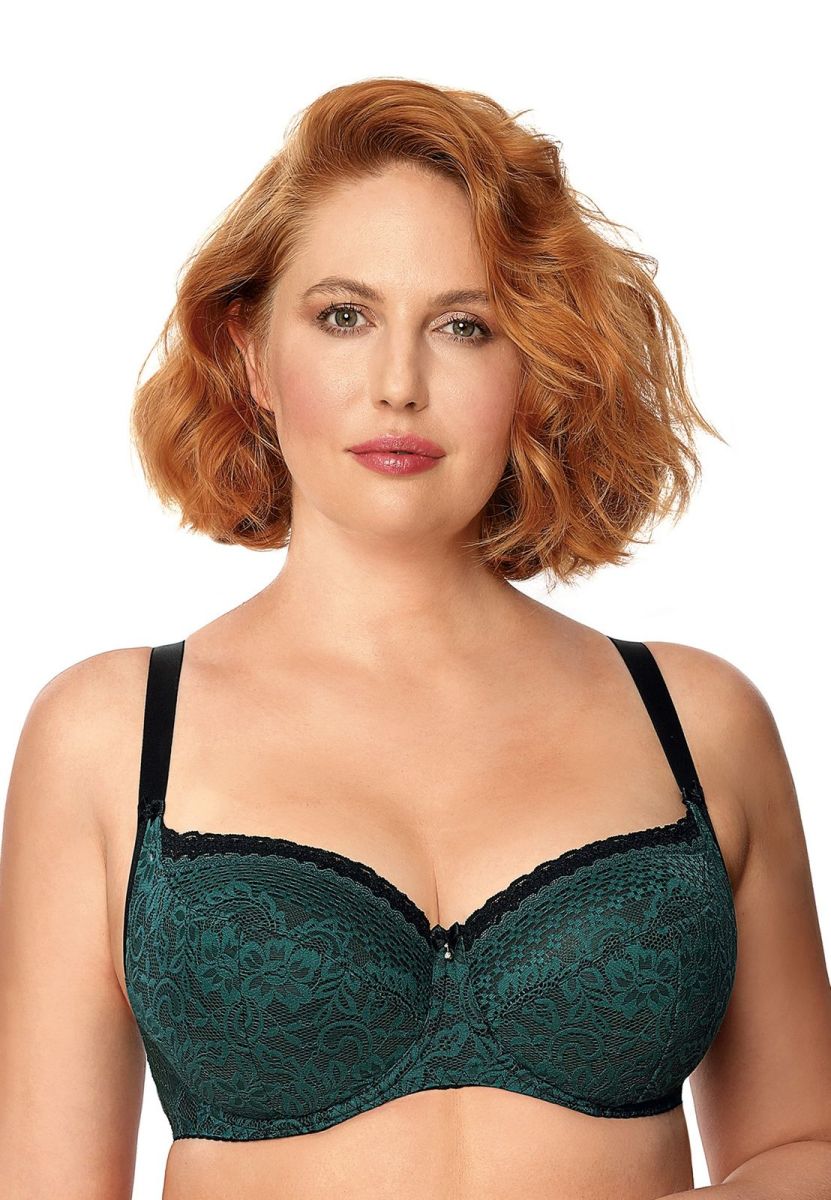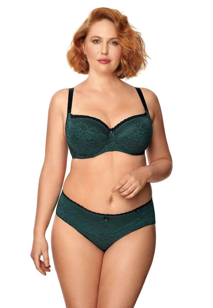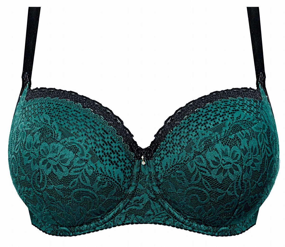 Бюстгальтер на косточках, чашки шитые, нижняя часть чашки на тонком поролоне черного цвета, внутренняя сторона проложена хлопковым трикотажем, внешняя покрыта кружевом изумрудного цвета, верхняя часть чашки из кружева, продублирована черной сеткой. Бретельки пришиты, регулируются по длине. На спине застёжка на удлинитель, количество крючков в ряду застёжки, увеличивается пропорционально размеру бюстгальтера.