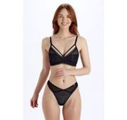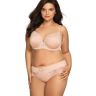 Бюстгальтер на косточках с боковыми поддержками, чашки шитые, на тонком поролоне, внутренняя сторона прошита хлопковым трикотажем, снаружи верхняя часть чашки декорирована сеткой с вышивкой. Бретельки регулируются по длине, на спине застёжка – удлинитель на крючках, фурнитура металлическая цвета меди.