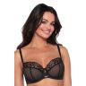 Бюстгальтер выполнен на косточках, чашки шитые, нижняя часть на тонком поролоне телесного цвета, внутри проложена хлопковым трикотажем, снаружи из черной сетки, верхняя часть чашки из черной сетки с вышивкой черной нитью, напоминающей фактуру крыльев бабочки, армирована силиконовой лентой. Бретельки не отстёгиваются, регулируются по длине, фурнитура цвета желтого золота, пояс из эластичного сетчатого полотна разной степени плотности. На спине застёжка на удлинитель, количество крючков в ряду застёжки увеличивается пропорционально размеру бюстгальтера. У бюстгальтеров/купальных лифов AVA довольно тугой пояс, который адаптируется под тело после нескольких дней носки или одной-двух стирок. Рекомендуем использовать удлинитель пояса бюстгальтера на первое время либо выбирать следующий за «своим» размер, с поясом длиннее.