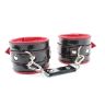 Наручники выполнены из черной натуральной лакированой кожи. Подклад изделия из красной перчаточной кожи. Аксессуар декорирован металлическими заклёпками. Наручники надежно фиксируются пряжками и ремнями, позволяющими выбрать нужный размер, подойдут на обхват руки от 16 до 26 см. Кожаное соединение на карабинах фиксирует наручники вместе. На каждом аксессуаре два полукольца из сварной фурнитуры. Стильные наручники помогу воплотить эротические фантазии в реальность. Ширина - 6 см.