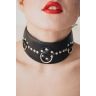 Ошейник с расширением впереди выполнен из качественной натуральной черной кожи, мягкий и комфортный в использовании. На изделии находятся три сварных полукольца. Аксессуар декорирован металлическими заклепками. Ошейник фиксируется металлическими кнопками, позволяющими подобрать нужный размер, подойдет на обхват шеи от 30 до 36 см. Стильный аксессуар поможет воплотить эротические фантазии в реальность. Ширина - 6 см.