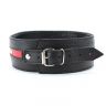 Ошейник выполнен из натуральной кожи черного цвета, декорирован вставкой из красной кожи, заклепками и тремя металлическими полукольцами. Ремень позволяет выбрать нужный размер, подойдет на обхват от 44 до 55 см. Металлическая пряжка надежно фиксирует, подклад из нежной кожи обеспечивает комфорт. Стильный аксессуар поможет воплотить эротические фантазии в реальность. Ширина - 5 см.