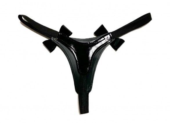 Сексуальные черные стринги, выполненные из эко-кожи. Декорированы спереди двумя бантиками. Лицевая сторона выполнена из лакового материала, а внутренняя из матового. Благодаря эластичной резинке, отлично сядут по фигуре, подойдут на размеры 40-46. Очень красивая и удобная модель, которая поможет создать дерзкий сексуальный образ для вашей любовной игры!