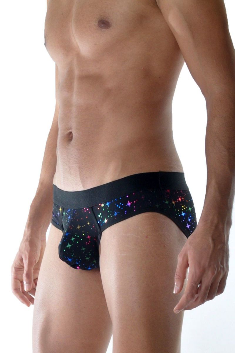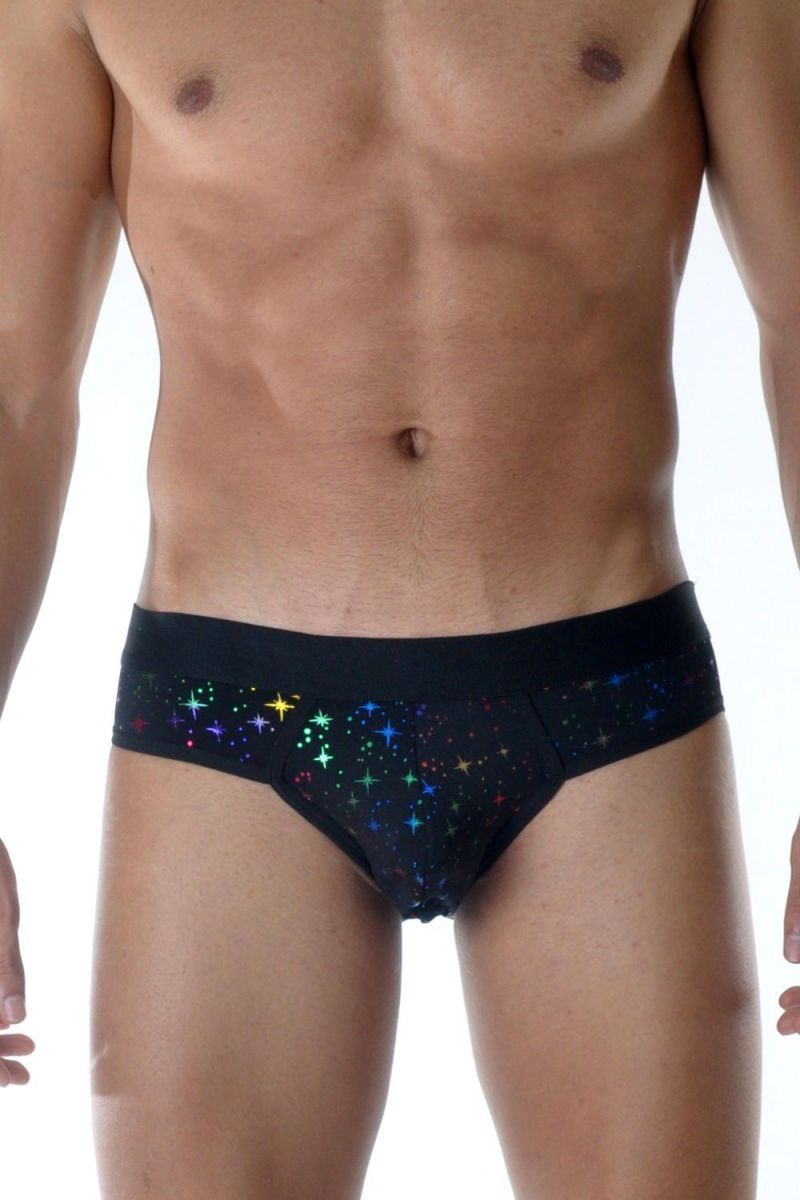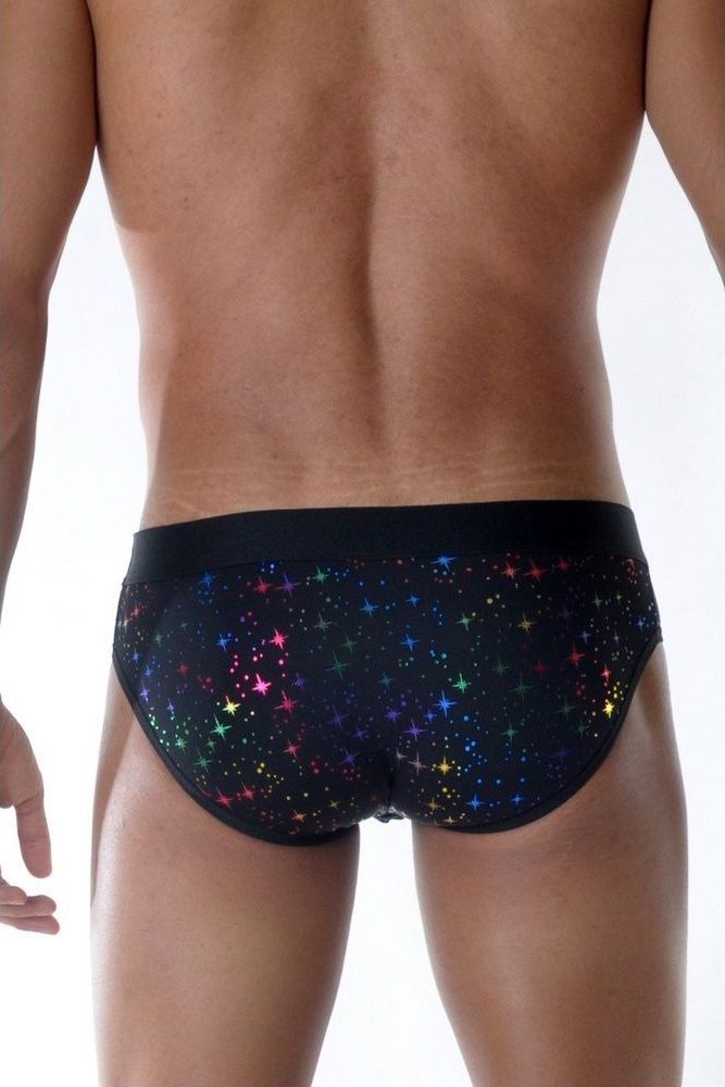 Черные мужские трусы-слипы с разноцветными блестящими звездочками.