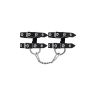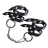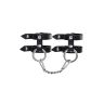 Наличие двух колец и карабинов, соединенных между собой металлической цепочкой, позволяет использовать изделие как раздельно – аксессуар-манжеты, так и как наручники для фиксации. К широким металлическим кольцам также можно присоединить и другие аксессуары при помощи карабинов.