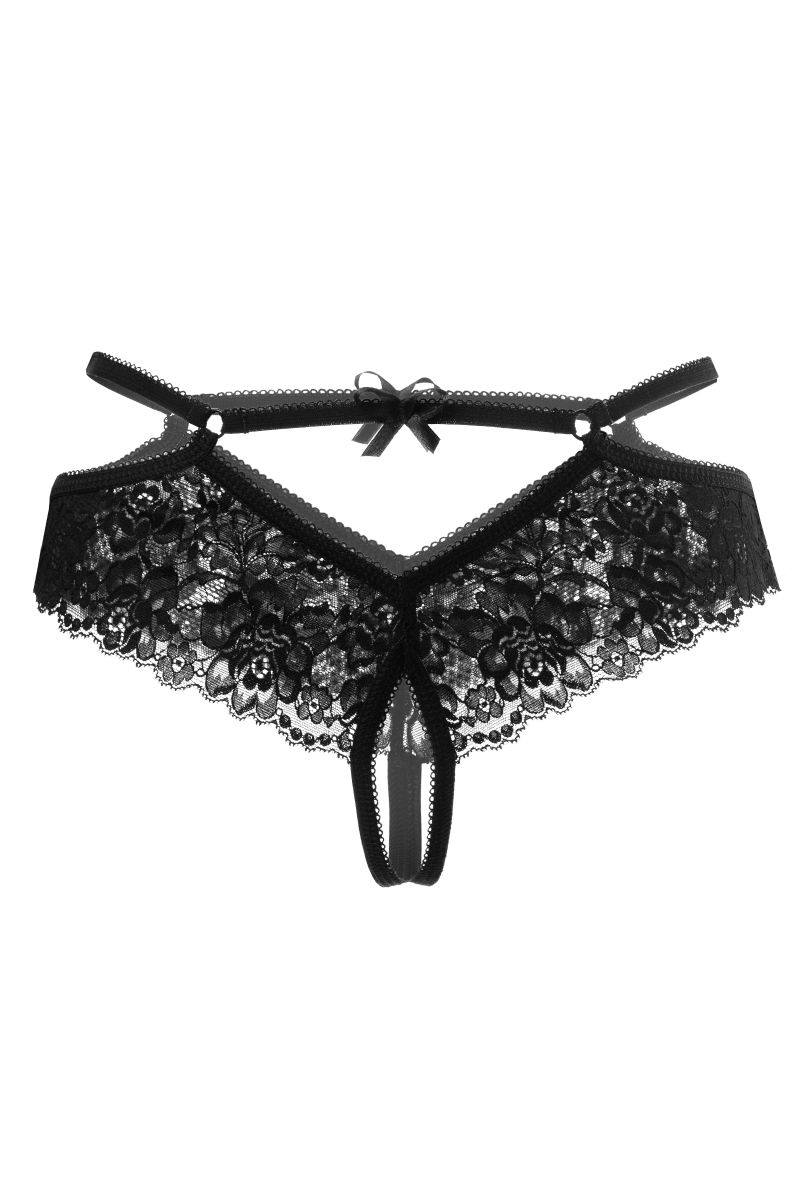 Эластичное кружево рисует волнующий контур бедер. Тонкие перемычки, украшенные миниатюрными кольцами и игривым атласным бантиком, расставляют интригующие акценты. Пикантный вырез в интимной зоне подогревает желание и позволяет наслаждаться игрой, не снимая при этом трусики.