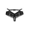 Эластичное кружево рисует волнующий контур бедер. Тонкие перемычки, украшенные миниатюрными кольцами и игривым атласным бантиком, расставляют интригующие акценты. Пикантный вырез в интимной зоне подогревает желание и позволяет наслаждаться игрой, не снимая при этом трусики.