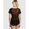Футболка из плотной эластичной ткани с коротким рукавом и вырезом-лодочкой. Верхняя часть модели и рукава выполнены из утонченного эластичного кружева с цветочным мотивом.