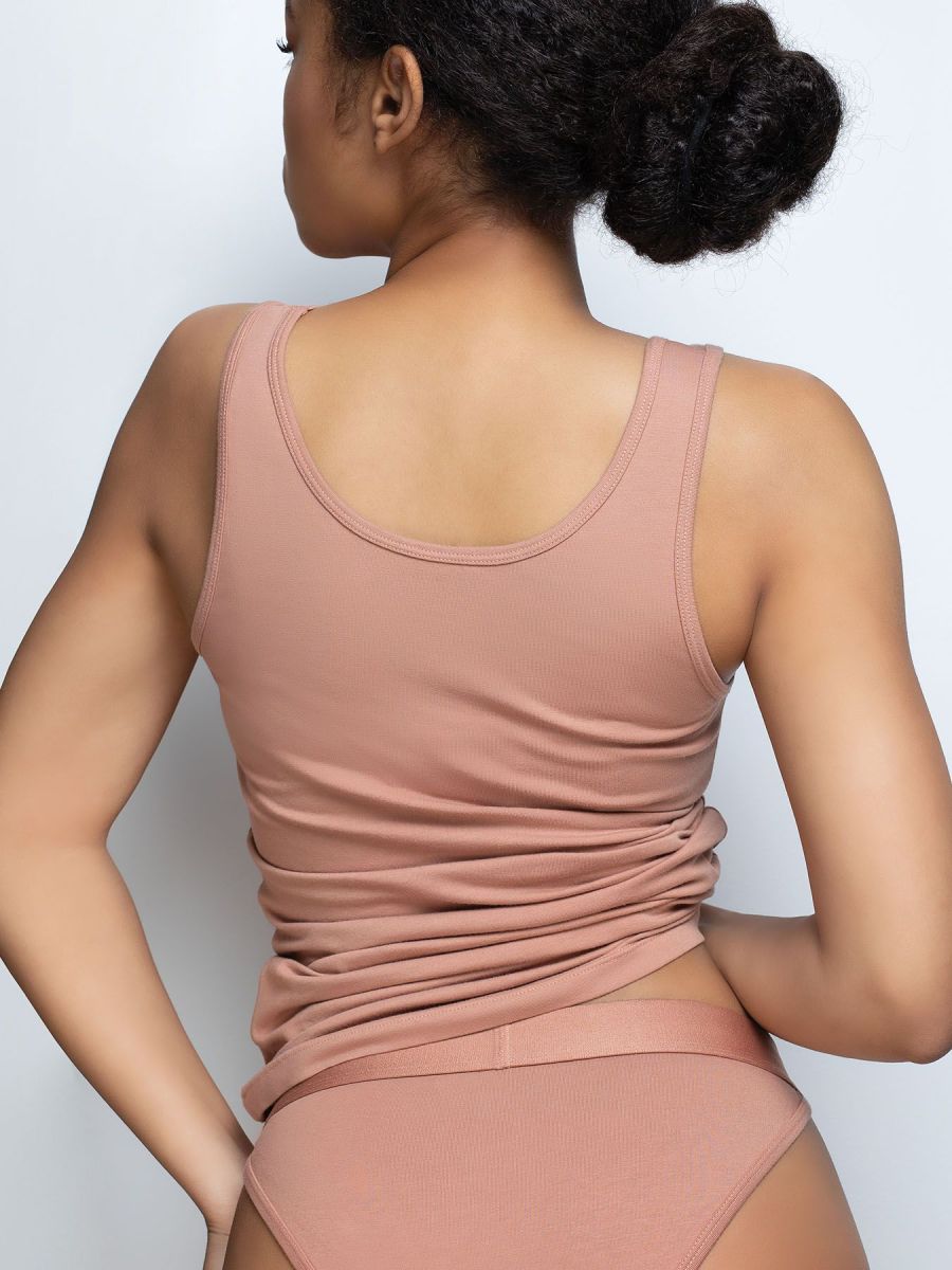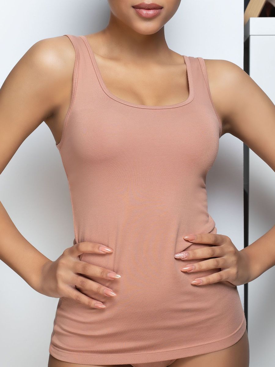 Женская майка из комфортного гладкого трикотажа на основе хлопка и модала. Широкие бретели, круглый женственный вырез – эту майку можно использовать не только как белье, но и как базовый топ под пиджак или жакет.