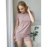 Женский домашний комплект-пижама: футболка с коротким рукавом и шорты на резинке. Идеален для сна, а также в нем можно выйти к завтраку в узком семейном кругу. Приятная к телу ткань на основе вискозы, дымчато-сиреневого цвета, имеет утонченный рисунок в виде мелких перфорированных ромбиков. Вырез горловины футболки и кокетка, а также низ шорт отделаны кружевом в тон. Вертикальные защипы на груди образуют манишку, украшенную планкой с блестящими пуговками – имитацией застежки. Шорты имеют разрезики в боковых швах для удобства посадки и свободы движений. В комплекте: футболка, шорты.