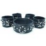 Набор аксессуаров, изготовленных из натуральной кожи. В него входят: наручи и поножи, украшенные заклепками, которые можно соединять и комбинировать между собой при помощи цепей с карабинами (входят в комплект) Размер меняется при помощи застежки. Также имеется черный ошейник с одним кольцом. Размер регулируется застежками на кнопках. Ширина наручников и поножей - 6 см.