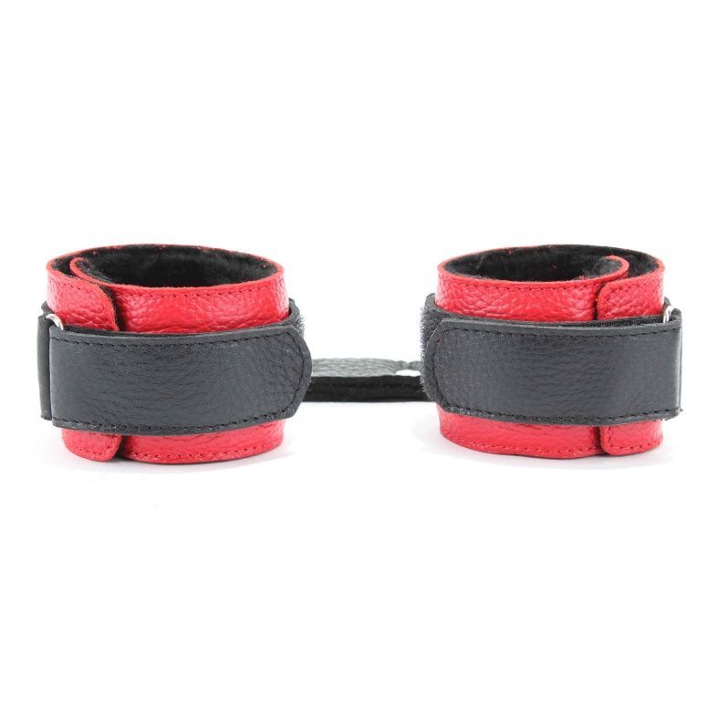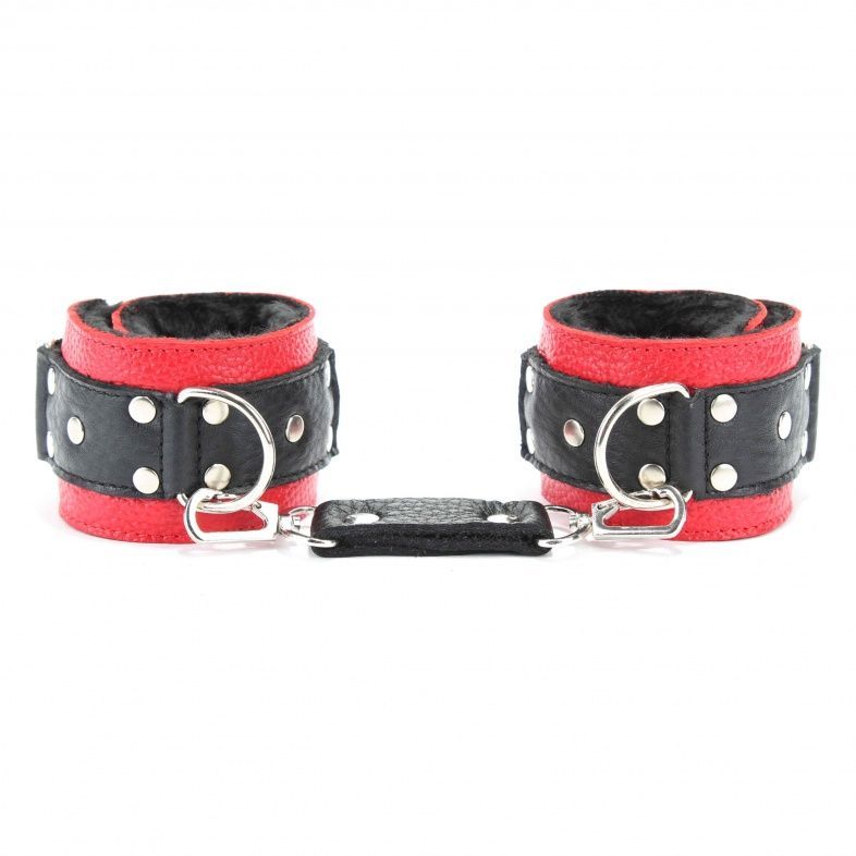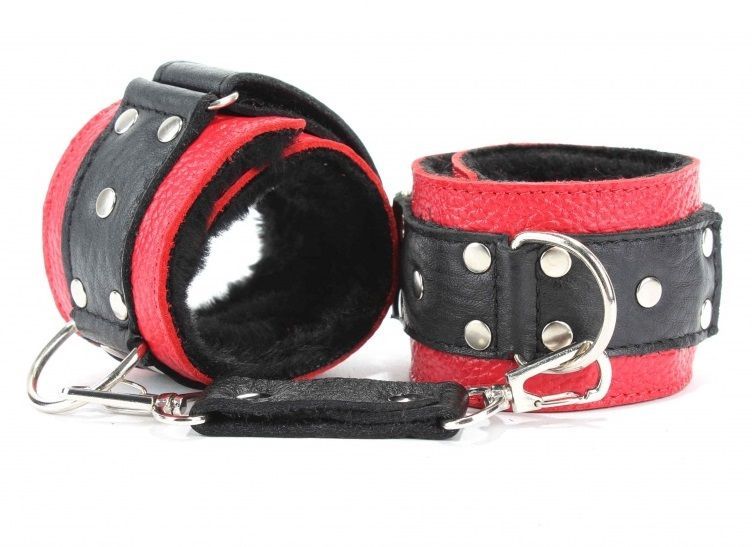 Наручники выполнены из красной натуральной кожи, легко, но надежно фиксируются черными ремнями на липучке, позволяя выбрать нужный размер, подойдут на обхват руки от 15 до 26 см. Аксессуар декорирован заклепками. Кожаное соединение на карабинах фиксирует наручники вместе. Мягкий подклад из меха обеспечит комфортное пребывание в образе, помогая полностью погрузиться в БДСМ игру. Ширина - 5,5 см.