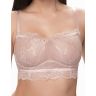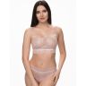 Кружевной бюстгальтер-бралетт с легкими чашками на каркасах, по центру декорирован эластичной сеткой. Благодаря вертикальным вытачкам на чашках грудь имеет поддержку снизу. Передняя часть стана укреплена неэластичным трикотажным полотном. По горловине и стану настрочена 12 мм эластичная лента на плоскошовной машине. Выполнен из объемного эластичного кружева с блеском.