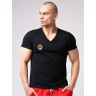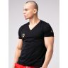 Мужская футболка в милитари стиле. Шеврон на груди с камуфляжной символикой, принт на рукаве в виде военного знака различия. Модный силуэт, V-образный вырез горловины, рукава подвернуты наружу.
