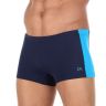 Мужские пляжные плавки-боксеры от Doreanse глубокого тёмно-синего цвета с контрастными бирюзовыми вставками-лампасами по бокам. Мягкий шелковистый материал красиво смотрится на пляже, приятен для тела и быстро высыхает после намокания. На передней панели внутри вшита мягкая шелковистая подкладка. В эластичном поясе вставлен плоский регулирующий шнурок с фирменным логотипом «Doreanse». На левом бедре вышивка из двух стилизованных латинских букв «DA» - символ бренда Doreanse.