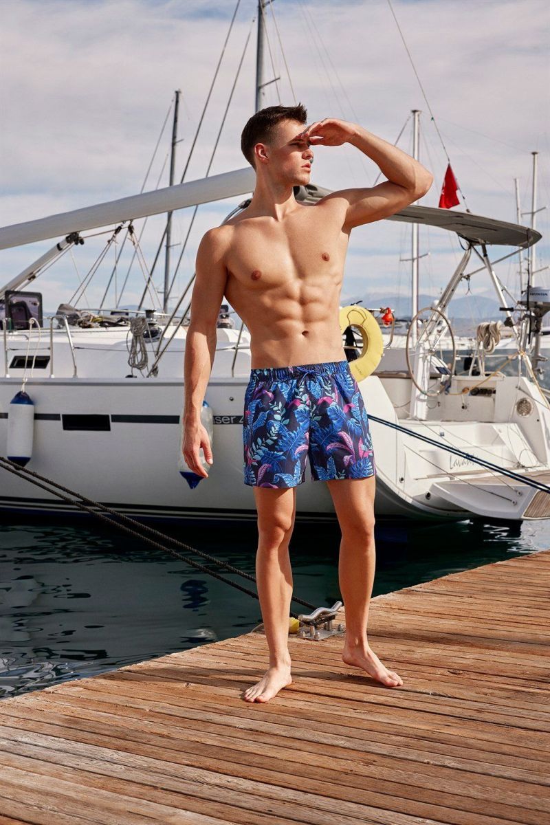 Мужские пляжные шорты от Doreanse тёмно-синего цвета с ярким тропическим принтом. Очень мягкий и приятный для тела материал. Внутри вшита эластичная поддерживающая сеточка. По бокам 2 удобных вшивных кармана, сзади 1 карман с застёжкой-молнией. В эластичный пояс вставлен регулирующий шнурок с логотипом «Doreanse» и стильными металлическими наконечниками.