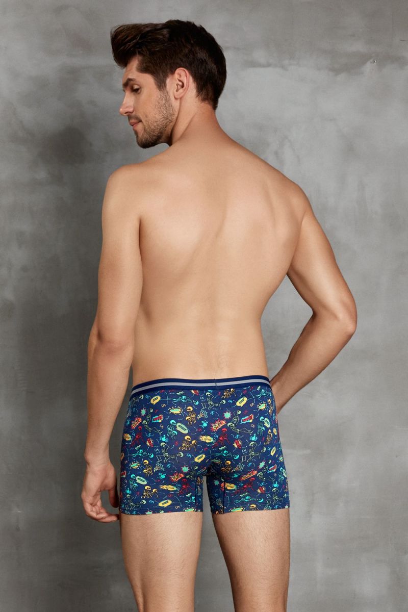 Мужские облегающие трусы-боксеры от Doreanse тёмно-синего цвета с принтом из забавных скелетиков. Очень мягкий и приятный для тела материал из смеси натуральных волокон (хлопок + модал) обеспечит максимальный комфорт на целый день. Удобный анатомический крой без заднего и боковых швов. Передняя панель с подкладкой, по краям обработана комфортными плоскими швами. На поясе мягкая пришивная резинка с фирменным логотипом «Doreanse».