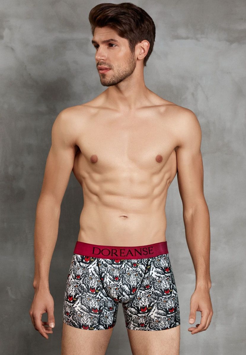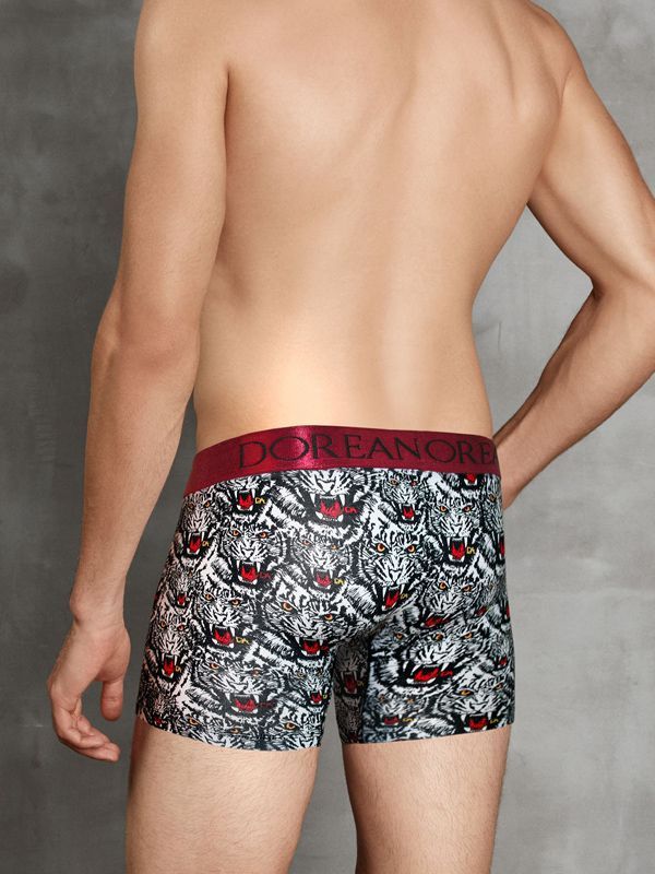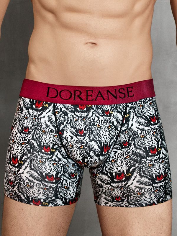 Мужские облегающие трусы-боксеры немного удлинённой формы с принтом в виде разъярённых тигриных морд. Мягкий эластичный материал из смеси натуральных волокон (хлопок + модал) очень приятен для тела. На поясе контрастная бордовая резинка с фирменным логотипом бренда «Doreanse». Передняя панель выполнена из двойного слоя материала.