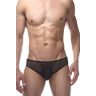 Мужские слипы, на ягодицах у которых три ряда кружев. Спереди трусы классической формы, из полупрозрачного черного материала.