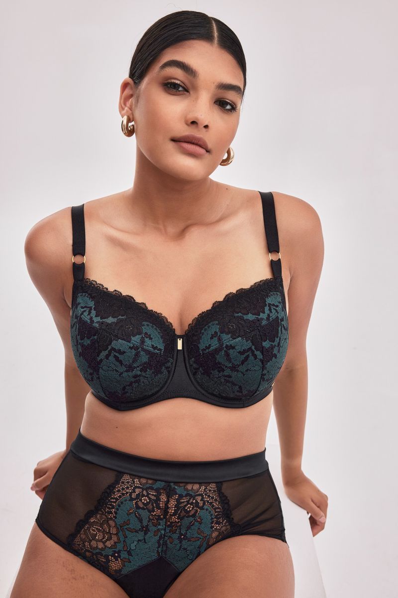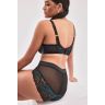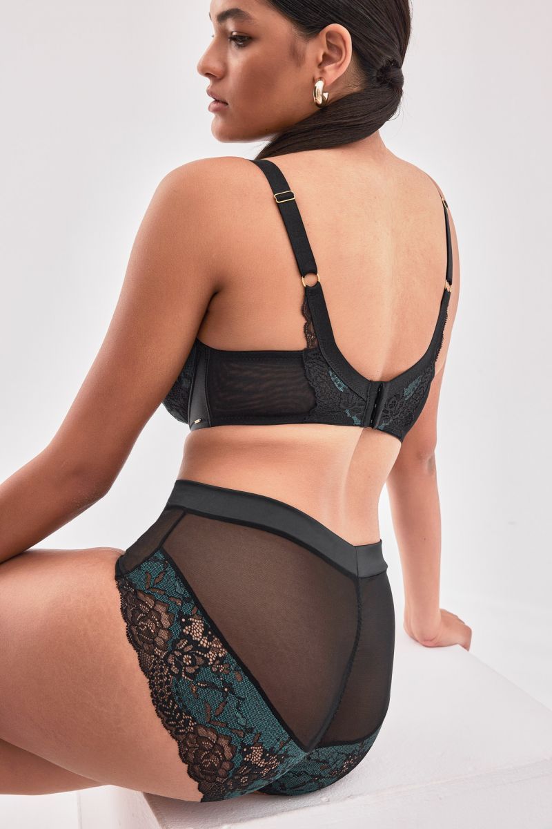 Бюстгальтер Moon PU выполнен с чашечками на косточках, с дополнительными боковыми поддержками, чашки шитые, нижняя часть из тонкого поролона, снаружи и верхняя часть чашек из черно-зеленого кружева. Спинка из двух слоев черной сетки. Бретельки регулируются по длине, не отстёгиваются. На спине застёжка на удлинитель, количество крючков в ряду застёжки увеличивается пропорционально размеру бюстгальтера. Фурнитура металлическая цвета желтого золота.