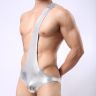 Серебристые мужские трусы с плечевой бретелью.