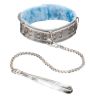 Ошейник изготовлен из искусственной кожи. С внутренней стороны подклада из мягкого меха. При изготовлении использована фурнитура с никелевым покрытием. Металлическая цепочка (поводок), с карабином на конце, поможет вам с лёгкостью управлять своим партнёром. Размер универсальный.