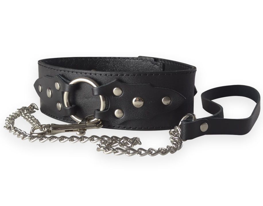 Чёрный ошейник из толстой натуральной кожи имеет внутреннюю подкладку из тонкой кожи. Так как ошейник достаточно широкий, хорошо просматривается текстура натуральной кожи, в виде мелкой паутинки. Декоративным элементом данного аксессуара, является металлическое кольцо, удерживаемое двумя кожаными узорчатыми накладка, оно также используется для присоединения поводка-цепочки к ошейнику. Размер изделия регулируется металлической пряжкой. Ширина - 5 см.