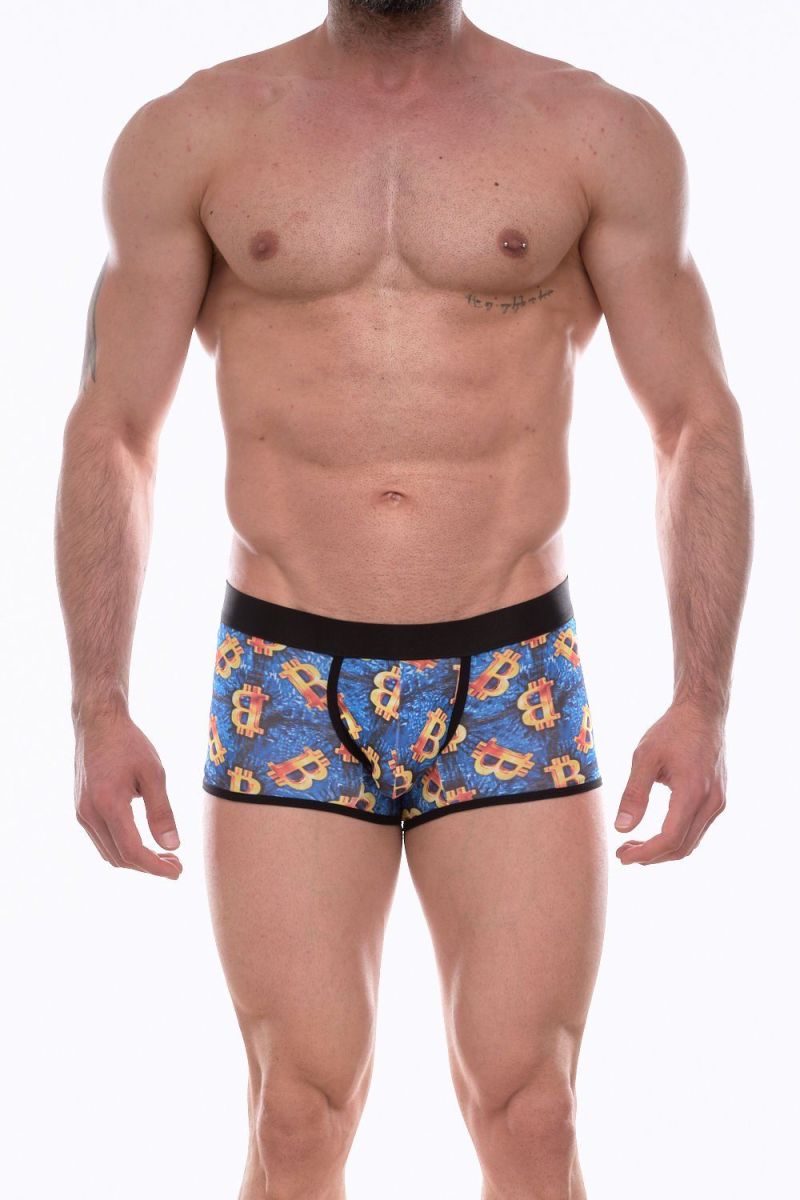 Синие трусы-боксеры с крупным принтом.