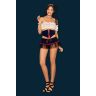 Соблазнительный костюм славянки состоит из пяти частей. Полупрозрачный топ-бюстгальтер с принтом в мелкий горошек, на спинке очаровательная шнуровка. Два коротких рукава, которые не соединены с топом. Широкий пояс с красной шнуровкой. Короткая юбка с рюшами очень кокетливо ниспадает на бедра, сзади завязывается на атласные ленты. В комплекте: топ-бюстгальтер, 2 рукава, пояс, юбка, трусики-стринги.