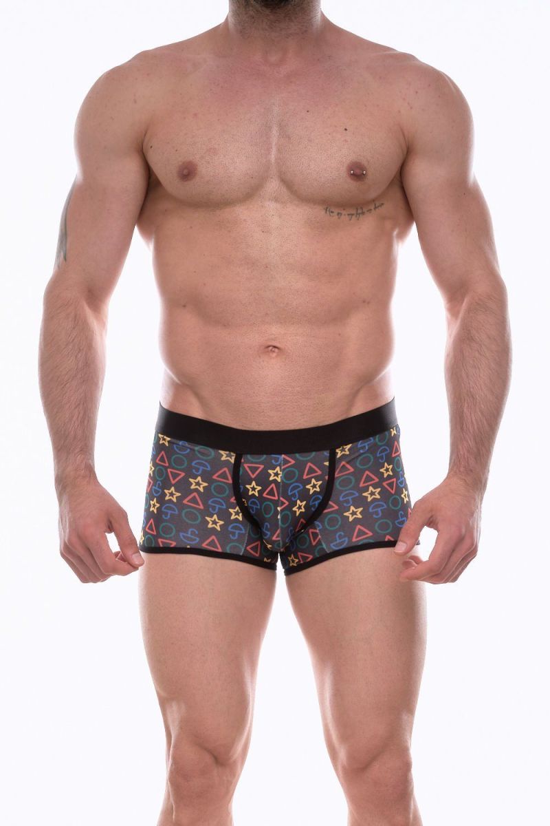Темно-серые трусы-боксеры с разноцветным принтом.