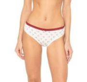 Трусы со средней линией талии, выполнены из деликатного принтованного хлопка со спандексом. Контрастный принт с изображением треугольников. Вырез ножки отделан тесьмой в цвет изделия, талия - широкой тесьмой с мережкой, в цвет изделия. Декор - атласный бантик. Хлопковая ластовица.