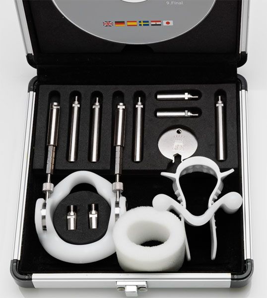 Комплектация: удлиняющие стержни (4х5 см, 2х2,5 см), гибридная насадка Comfort (используется ремешок или жгут), фиксирующий ремешок, силиконовый жгут-фиксатор, смягчающая прокладка, упорное кольцо с пружинным механизмом.